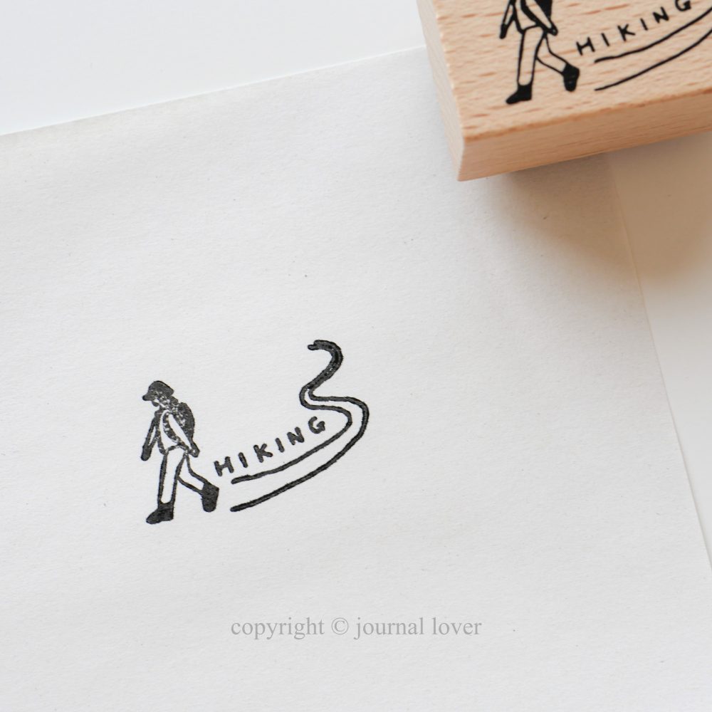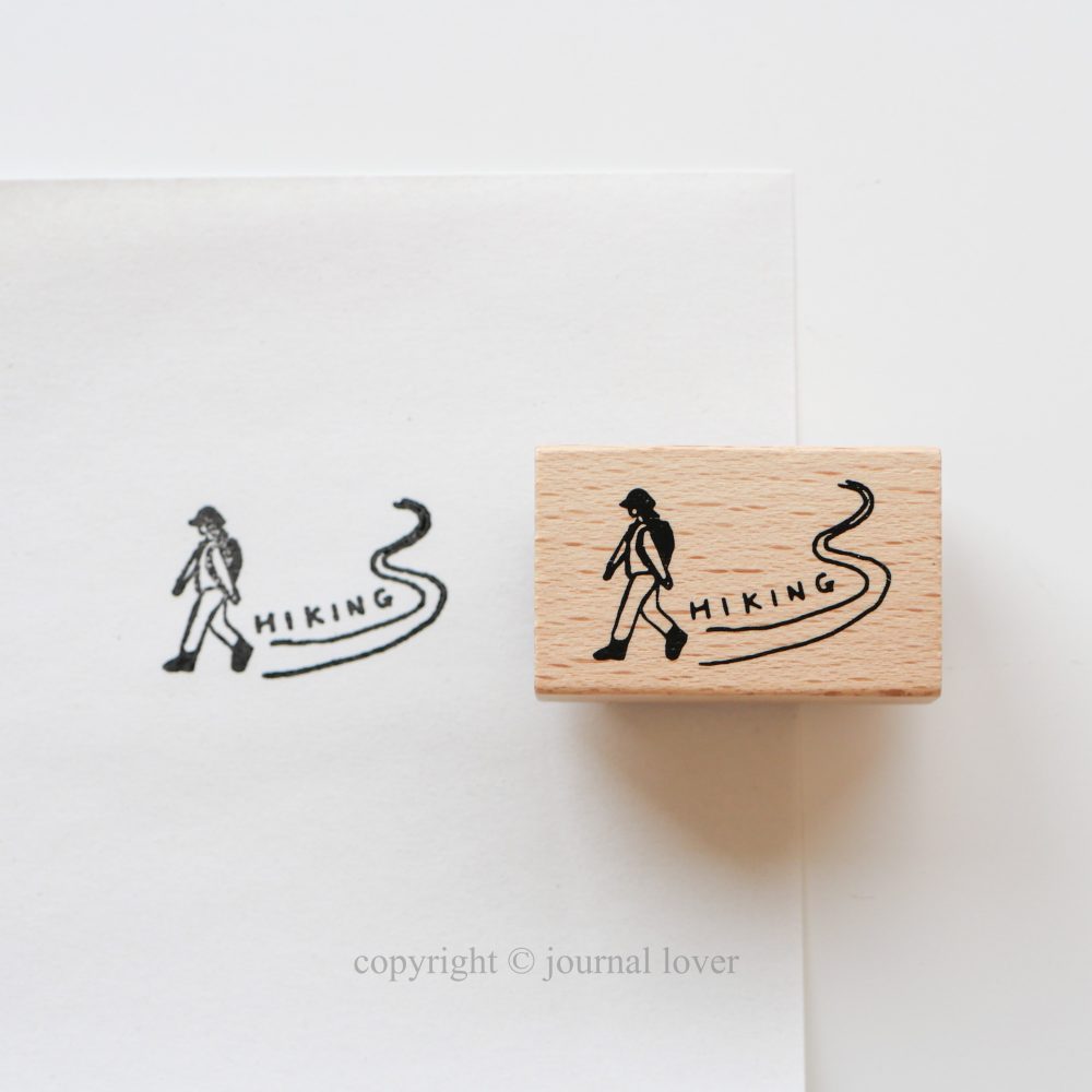 ハイキングを楽しむ人を描いたスタンプで、道には「Hiking」の英字が入っています。